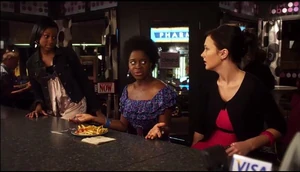 In Somebody, Chantay is sitting with Holly J. and Anya while they talk.