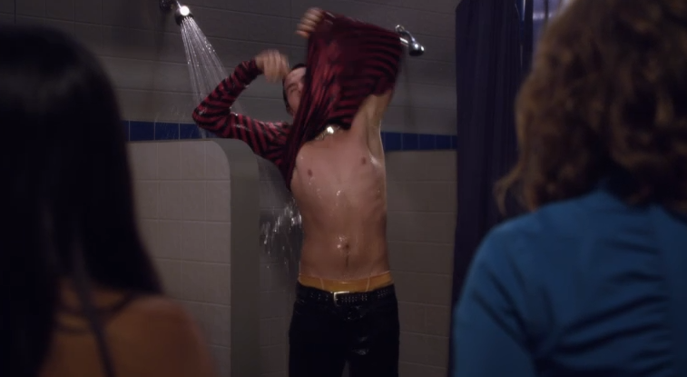In Ray Of Light (2), Clare and Alli find Eli showering with his clothes on in the girls changing room. Clare asks what the hell is he thinking and Eli says she was forcing him to talk as he proceeds to take off his clothes. Alli then says "that is more Eli than I ever wanted to see" and throws him a towel. Soon Eli runs through the school naked as Alli and Clare chase after him until he runs into Mr. Simpson and hugs him.