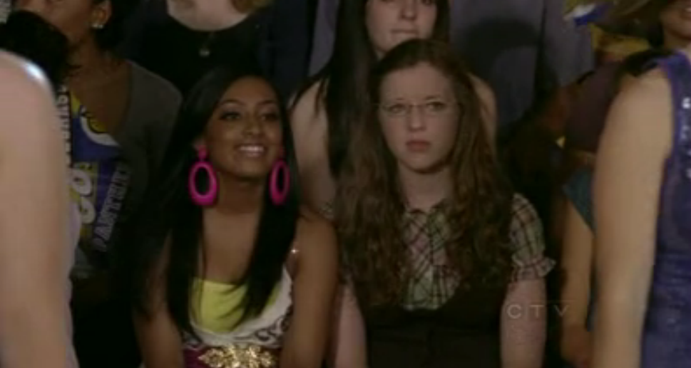 In Gives You Hell (1), Jenna, Clare, and Alli are sitting next to one another at the pep rally for the Toronto Ice Hounds.