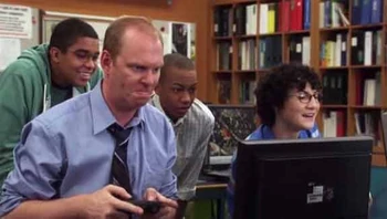 In You Don't Know My Name (1), Dave learns from Sav that Mr. Simpson has cancelled Band Slam. Connor, Dave, and Wesley are upset to find out that their band is dropping out of "Band Slam", because Mr. Simpson had to cut the event. The next day Connor, is still at school, and is asleep at the desk over the computer. Dave and Wesley walk in to notice him knocked out cold sleeping. Ms. Oh walks around and notices Connor sleeping as well. She bangs on the table to wake him up and is mad at him for drooling on the keyboards, since the computers are expensive. Dave and Wesley nudge him to wake him up even more, Connor tells them he wishes he didn't hate coffee, and Wesley goes off talking about how it took him that long to beat the villager. It turns out Connor was up all night long playing RPG's. Wesley tries to tell him he loves RPG's too, but he's gone too deep and he needs to come up for air. Connor tells them that they don't understand, and nobody else in his life does as well. After class, Connor is on "Real of Doom", and is refreshing the page to see if his "girlfriend" is online, after he sent her a chat message about playing again. Dave and Wesley come in to ask him if he wants to shoot some hoops, Connor tells them in a little bit because he's waiting for something from a girl. Wesley asks if it's a girlfriend, and Connor tells them no, just a friend that's a girl, but not a "girl-friend". Dave tells him to "shut the front door", and Connor tells him yes that they play online and they listen to each other and talk to each other and understand each other. Dave and Wesley ask if he has a picture of her, but he says yes right here, he points to her avatar "LoveQueen16". They laugh, and ask if he's serious. Connor tries to explain she may not be perfect, Dave tells him that he's never seen her so for all he knows she could be some fat dude. Connor is upset, but they tell him to come play basketball, he tells them he'll be out in a minute, they leave and he gets a message from her which is her cell number, she asks for his and he gives it to her, he's happy.