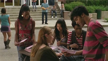 In Waiting for a Girl Like You, Anya, Sav, Leia, and Danny are sitting at a table together before Chantay approaches.