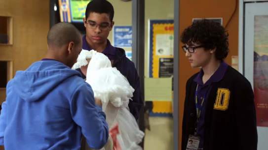In Umbrella (2), in the hallway Dave is seen trying to convince his new gang of "friends" that he is nothing like his dad. Julian wants proof of this and wants Dave to get something from his dad's cruiser. Dave says he will do it and the gang leaves. Later Dave secretly goes into his Dad's car in search of something when Wesley interrupts and they argue about being friends. Wesley leaves and Dave finds a taser gun at the front of the car. Dave steals the taser in order to impress the gang and it works. But they still want Dave to prove he’s a badass and use it on someone. That someone, unfortunately, is Wesley, who happens to be walking by. Later, Wesley sees Dave trying to put the taser back in the cruiser and Dave tries to apologize to Wesley. Dave tases his best friend, leaving him shaking on the ground in pain. Wesley tells Dave that if he’s really sorry then Wesley should get to tase Dave. Dave readies himself for the pain and then Wesley (being the nice guy he is) tries to purple nurple Dave and the two laugh and wrestle around on the grass. They finally forgive each other and become friends again.