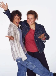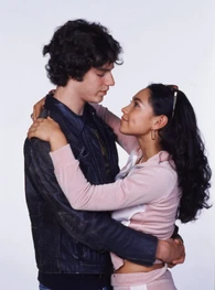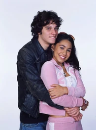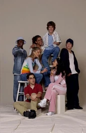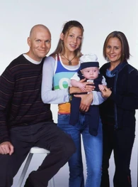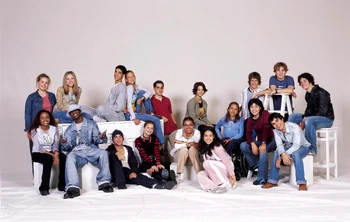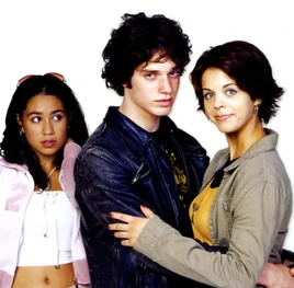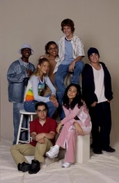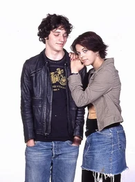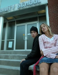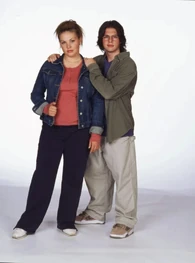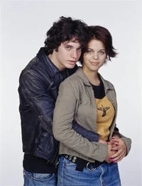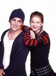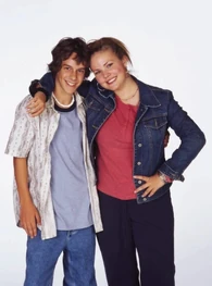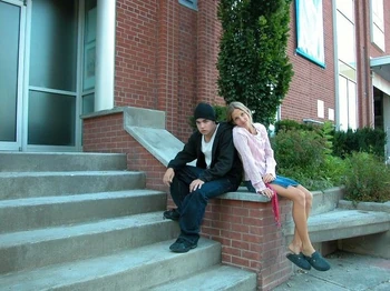 The camera zooms to the right. We see Spike sitting next Snake at the school's outside lunch table. The name "Amanda Stepto" fades in on the lower left below Spike and then the name "Stefan Brogren" fades in on the upper right below Snake. Snake has his arm around Spike and kisses her forehead while she smiles. Their names then fade out in the same order they faded in. The camera zooms to the right and we see Joey and Caitlin sitting across from them. The name "Pat Mastroianni" fades in on the upper left below Joey. Then the name "Stacie Mistysyn" fades in on the lower right below Caitlin. They both look at each other and smile. Pat's name zooms off to the left and then Stacie's name zooms as well.
