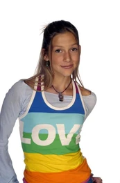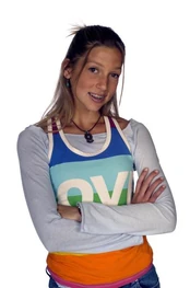 The camera then zooms to the right and focuses in the gym where two cheerleaders throw another cheerleader and catch her. The camera zooms down where we see Hazel. The name "Andrea Lewis" fades in. She's smiling as Paige climbs up on her shoulder and grabs her leg to build a pyramid. The camera then shows Manny standing on the other side holding onto Paige's leg. The name "Cassie Steele" fades in. She looks up and smiles. The camera zooms up and focuses on Paige. The name "Lauren Collins" appears. She's holding both arms up and smiling. Her name zooms off to the left. The camera zooms to the right and we see Terri holding a lacrosse stick standing by the Degrassi mural with the lacrosse team alongside Kendra. The name "Christina Schmidt" fades in. She smiles and looks to her right as J.T. runs in from the left. He stops and smiles as a boy behind him puts on his mascot head for him. During this the name "Ryan Cooley" appears. It then zooms down.