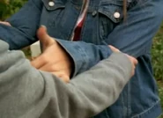 Rick pushes Terri onto the rock
