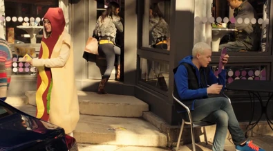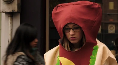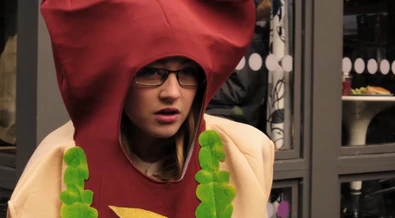 Maya is then seen dressed as a hot dog, singing out advertisement for the food restaurant she is helping out, miserable. She passes out flyers to people she passes and the mini ends as Maya groans in misery, "Kill me now!"