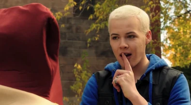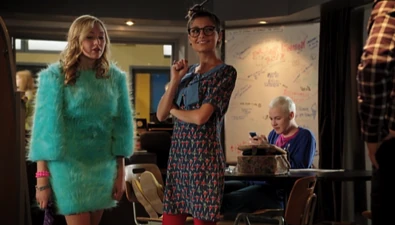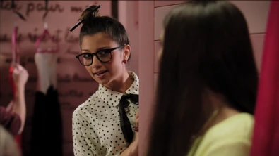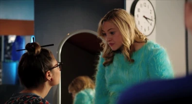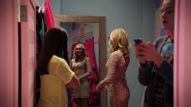 Maya is blindfolded and Imogen is finishing her dress. Maya is anxious to see how she looks, having paid Imogen to do the dress by hand. Imogen says she doesn't want her to see the dress of her dreams until it is done. After doing the finishing touches, Maya is allowed to see the dress. However, when Maya takes it off, she is surprised in horror, saying, "You said you'd make me look like Jennifer Lawerence!" Imogen says she can, but that would be too obvious and she doesn't do obvious. Imogen assures her that she'll still be "boiling hot", which is what she said she wanted. Maya explains that she wanted to look hot as in sexy, not hot physical/temperature wise. Imogen says that does make a lot more sense.