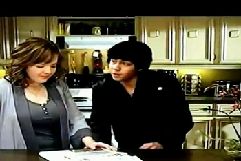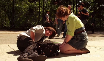 Part 6: Clare, which is set between Firestarter (2) and Watch Out Now, Zig and Miles, who have been on an adventure knocking on random doors and retracing their steps and find out where the keys to their handcuffed hands are, come upon Clare's house. She opens the door, confused, and asks what Zig has in his hands. Miles looks at it sarcastically and says it looks like a gift basket. Clare rolls her eyes and reads the card attached, "Clare, you won't tell me what you're craving, so I had to guess. Love, Eli." Clare then reads the cards labelling the food items, "something spicy, something sweet, something salty, and pickles." She chuckles as she reads the last one. Zig then asks if he thinks she's pregnant or something and she says she is. He says he's never going to have sex... again. Because, of course, he has before, he assures his company. After a very awkward exchange, Clare takes her basket, thanking them for delivering it. Miles clarifies that it was already on the doorstep when they got there. Clare then gives them information on their friend's whereabouts. Miles then wishes her luck and she does the same.