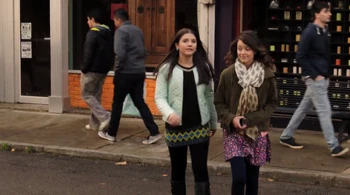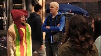 In Dress You Up, Zoë and Frankie are walking together down the street, and they approach Maya, who is in a hot dog costume, working to pay for a dress for the dance. They tease Maya about her work uniform, and Frankie takes a picture, intending to send it to Miles.