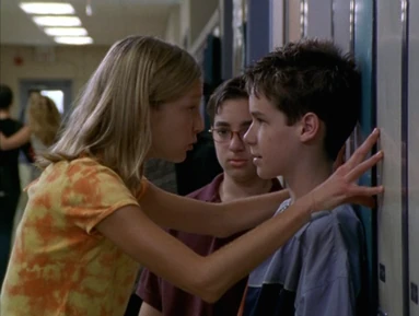 In Coming of Age, Emma, J.T., Manny, and Toby are all tanning outside together. In the halls before homeroom, J.T. says that Emma's shirt is sexy. Later when she gets her period and tries to hide it, J.T. teases her asking if she peed her pants. Emma responds by saying she got her period and J.T. shuts up.