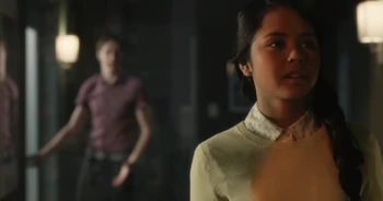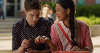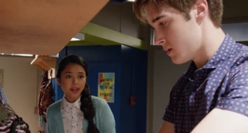 In #SinceWeBeinHonest, In a classroom, Esme walks in and spots Miles and quickly covers up her sleeve, Miles watches her from afar looking concerned.