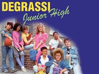 Next we see a sequence of shots: Degrassi Junior High with kids walking up to it; the kids in their class room running to their seats from the episode "Kiss Me Steph"; Mr. Raditch standing at the front door watching as the kids sit; Heather and Erica both raising their hands and smiling; Tim whispering to Joey at his seat from "The Cover Up"; Lucy raising her hand from "The Big Dance"; and Yick opening his locker and a bunch of papers falling out. Then we see a still of a boy. An animated hand with a chalkboard eraser wipes across the screen revealing another still of Lucy from "What A Night". Next we see another sequence of shots: Stephanie smiling and rolling her eyes as she turns around and looks at Arthur from "Kiss Me Steph"; Melanie by her locker staring at Snake as he puts his guitar bag on his shoulder, Snake then turns around and sees Melanie staring at him, and she quickly turns around from "The Great Race"; Rick high-five-ing Tim as he walks by from the episode "Kiss Me Steph"; Joey opening his locker and smiling; a few boys including Wheels, Jason, Shane, and Wai-Lee walking towards a van, and they stop and turn around from "The Great Race"; Kathleen standing by Melanie at her locker from "The Experiment"; Yick looking into his locker smiling next to Arthur from "The Great Race"; Yick opening a door to the broom closet revealing Arthur on the other side, who smiles with relief from "Kiss Me Steph"; and Rick taking Joey's hat off his head and smiling, then tossing it back to him from "The Cover Up"; Susie and Caitlin high-five-ing each other smiling from "The Cover Up".