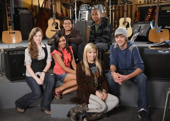 The camera pans to the right and we see Connor, K.C. and Clare in the science room working on a robot. The name "AJ Saudin" zooms in on the middle left under Connor. The name "Sam Earle" zooms from the top in the upper middle of the screen below KC. The name "Aislinn Paul" zooms in on the lower right below Clare. They all look in the camera and smile. The robot starts sparking and they all step back in shock. Their names all fade out. The camera pans to the left and shows Alli sitting by them watching them work. The name "Melinda Shankar" zooms in from the right. Alli looks into the camera and flips her hair and smiles. Her name zooms out on the left and the camera pans on the right. We see Jenna playing her guitar in the music room. The name "Jessica Tyler" comes in on the left. The camera zooms out and we see Dave sitting with his back to camera. The name "Jahmil French" fades in above Jessica's name. Her name fades out. Dave turns around and points to the camera. His name goes off on the left.