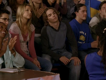 In Here Comes Your Man (2), when Emma tells Manny about kissing Sean, Manny is disappointed. Even though Manny still doesn't like Peter, she feels that the it's the principle that applies; it is wrong to cheat on one's partner at the end of the day. Sean is guilt ridden about Peter who is, at this point, trying to emulate his style of dress and his walk. However, Sean continues to pursue Emma, even buying her earrings. Emma is feeling torn in between two guys she really cares about, her ex and her current boyfriend. The confusion of the dilemma leads Emma to tell Peter that she needs space. Peter instantly assumes that she wants to break up and he realizes that Sean has something to do with it. Jealous and angry, Peter abuses his mother Ms. Hatzilakos' position as principal to open Sean's locker and frame him for possession of marijuana.