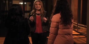 Alli and Tori then wait in the hallway to meet a Degrassi Alumni, with the help of Sav. Tori though doesn't even know who they are going to meet. Alli then responds that they need to bring out the big guns, who gets anything that she wants, and Paige then walks in saying "I guess that's my cue." Tori then knows her, and says "You're the Paige Michalchuk. The Paige Michalchuk." Paige then says her reputation precedes her. Alli then says "You know her?" Tori then says she is the team captain for every Power Squad, which Paige responds saying formerly Spirit Squad. Alli then says she had some help with her brother, Sav on calling her here. She then says she didn't know that they were that close. Paige then responds saying "Oh, we weren't..Until in L.A...We had a thing." Alli then says she didn't need to know that, and Paige says "Even though Sav is a few years younger..he really knows how to treat a lady." Alli then responds "Oh my god, really?" Tori then says "Yeah. TMI." They then get back to the subject, and Paige then tells them she has a plan. Alli and Tori both squeal