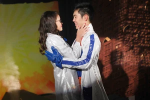 Winston and Frankie nearly kissing on stage during rehearsal.