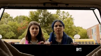 In #NotAllMen, In Zoë's mom's car, Zoë and Grace are texting each other and laughing despite sitting next to each other. They start mucking around with each other and then they arrive at school and get out of the car. Zoë's mom bans Zoë from spending time with Grace and Zoë watches Grace sadly from afar.