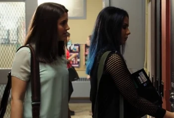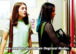 In the hallway, Zoë and Grace are greeting the new students. Grace says Degrassi is a safe space apart from her because she's stuffing herself back into the closet, Zoë says she's just not coming out to her mom but she can be out at school, Grace and Zoë briefly fight about this before they get interrupted by a "kiss in" held by the QSA - Queer Straight Alliance. They are not happy about being moved to a converted janitors closet for the pray room and when Vijay accuses Zoë of being a homophobe, Zoë responds by saying she can't be because she's gay herself which shocks him.